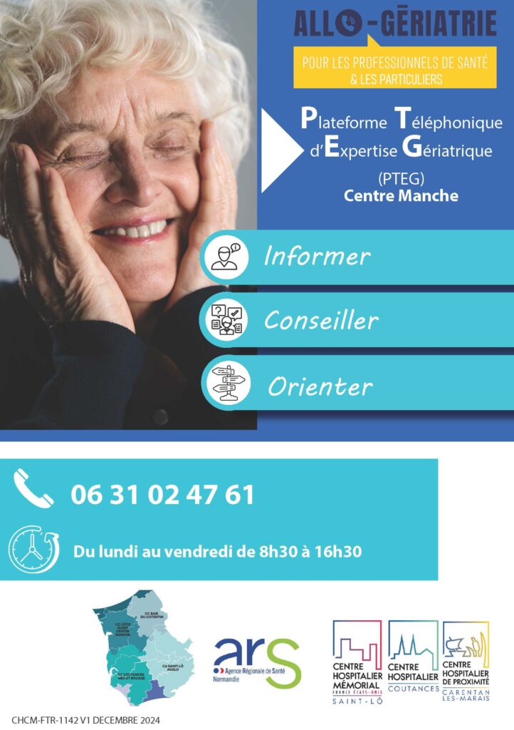 Allo Gériatrie est une plateforme téléphonique d’expertise gériatrique (PTEG) destinée aux professionnels (médecins généralistes et coordonnateurs d’EHPAD, les acteurs sociaux locaux, les professionnels de santé intervenant auprès des personnes âgées) et aux particuliers (familles, aidants et patients) pour le territoire du Centre Manche.